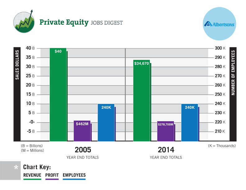 Albertsons accepted a $15.9 billion takeover offer ($9.8 billion in cash and stock and the assumption of $6.1 billion in debt) from SuperValu to buy most Albertson’s grocery operations. The drugstore chain CVS Caremark acquired 700 stand-alone Sav-On and Osco pharmacies and a distribution center, and a group including Cerberus Capital Management and the Kimco Realty Corporation acquired some 655 underperforming grocery stores and a number of distribution centers in the deal.