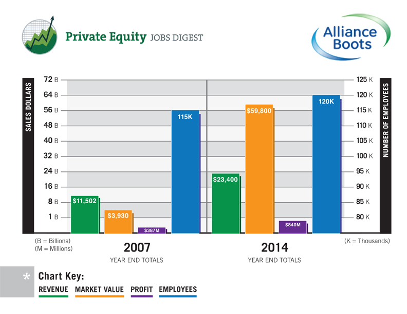 Kohlberg Kravis Roberts and Stefano Pessina, the company’s deputy chairman and largest shareholder, acquired the UK drug store retailer for £11.1 billion ($22.2 billion USD), outbidding financier Guy Hands. The takeover, which was the biggest ever leveraged buyout in Europe, gave KKR control of 3100 stores and a wholesale drug supplier to more than 125,000 pharmacies and hospitals. The buyout came only a year after the merger of Boots Group Plc (Boots the Chemist), and Alliance UniChem Plc.