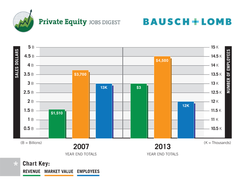 Bausch & Lomb, a global leader in eye care industry who fell into troubled times, was acquired by the private equity firm Warburg Pincus, for a total purchase price of $4.5 billion dollars. The deal included $3.67 billion in cash and the assumption of $830 million in debt. In 2013, the company was resold to Valeant for $8.7 billion – with $4.5 billion going to the investor group and $4.2 billion going to repay Bausch & Lomb debt.